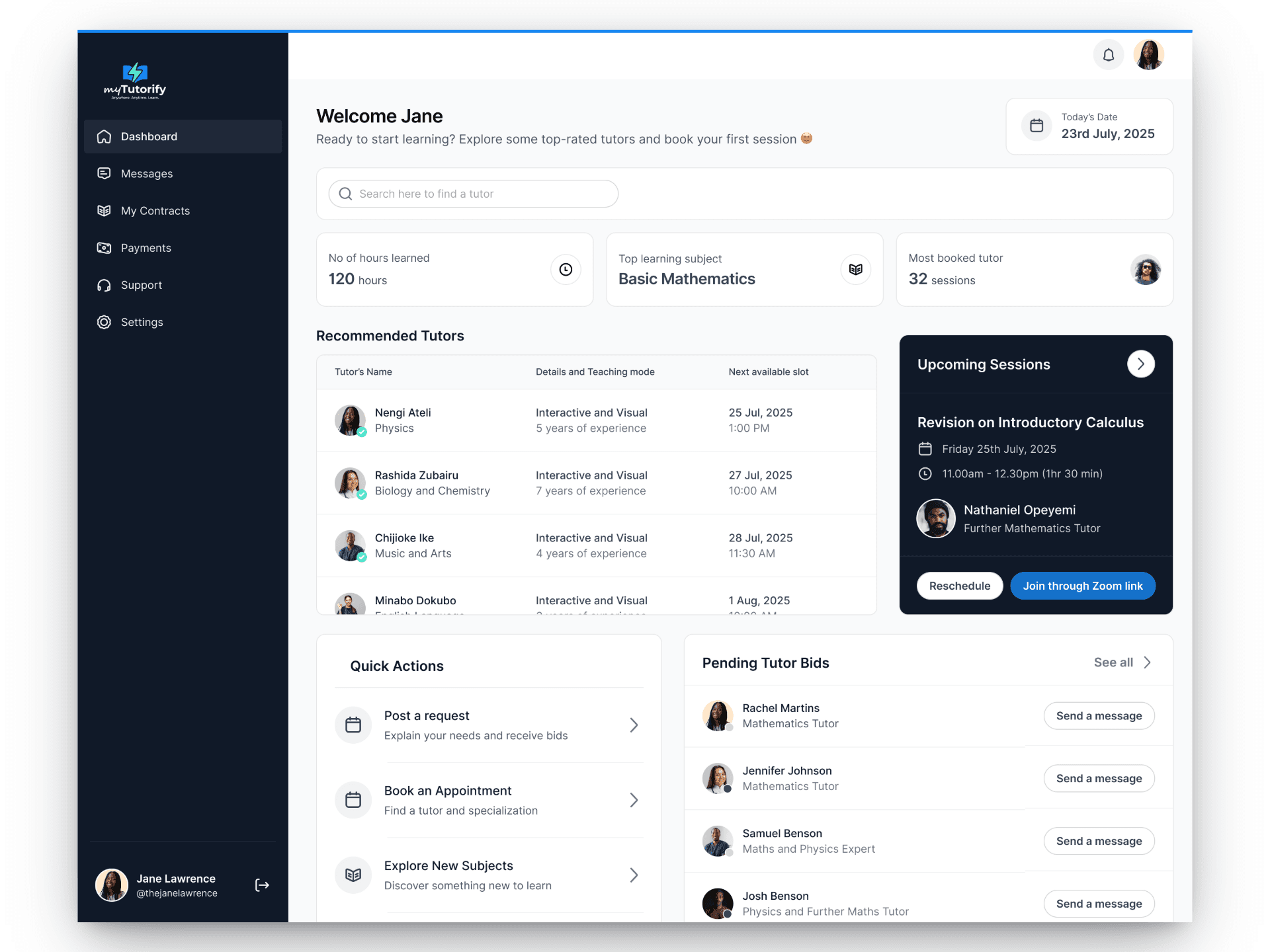 A personalized home screen where students discover tutors, manage sessions, track learning progress, and respond to tutor bids.