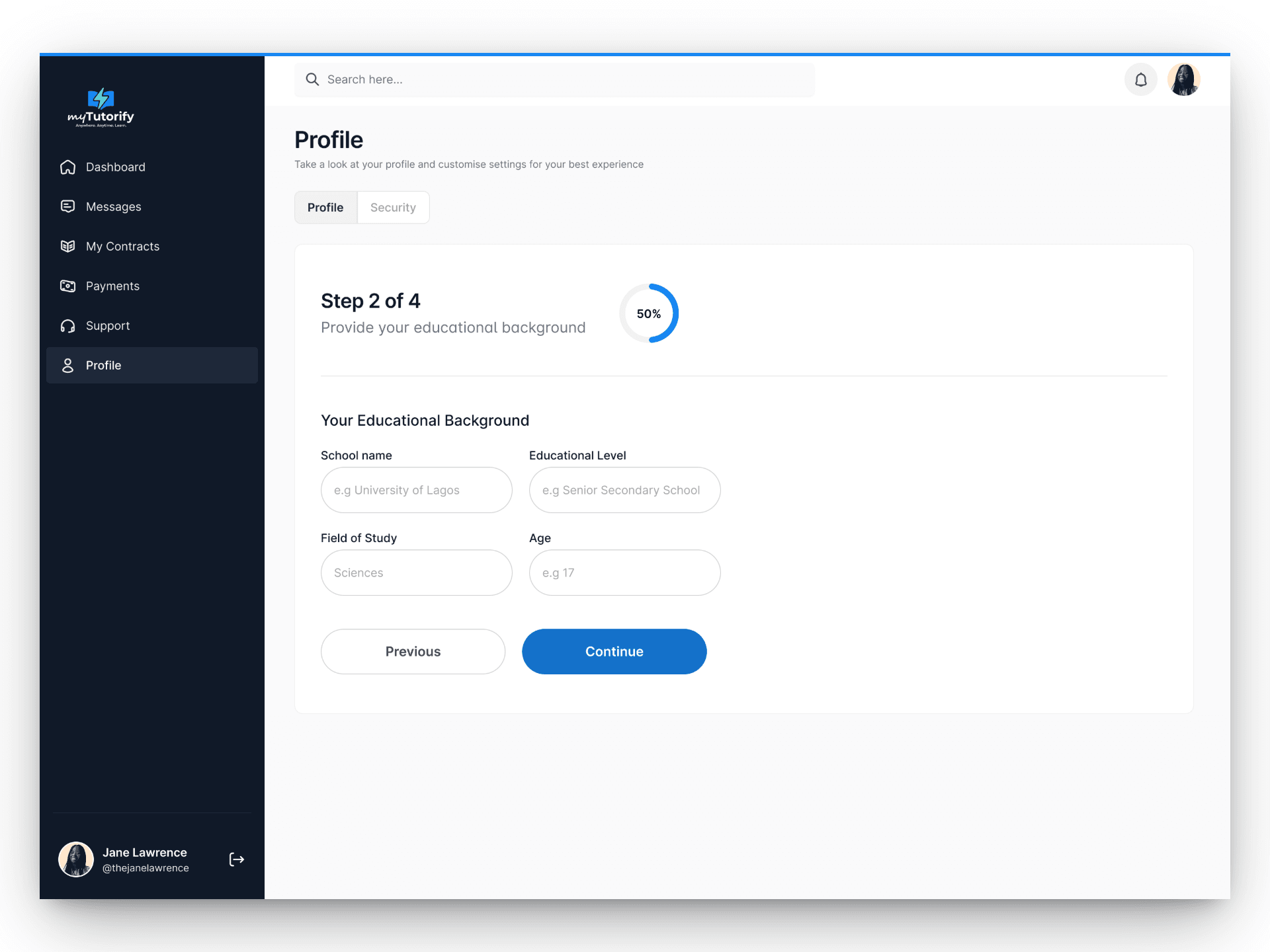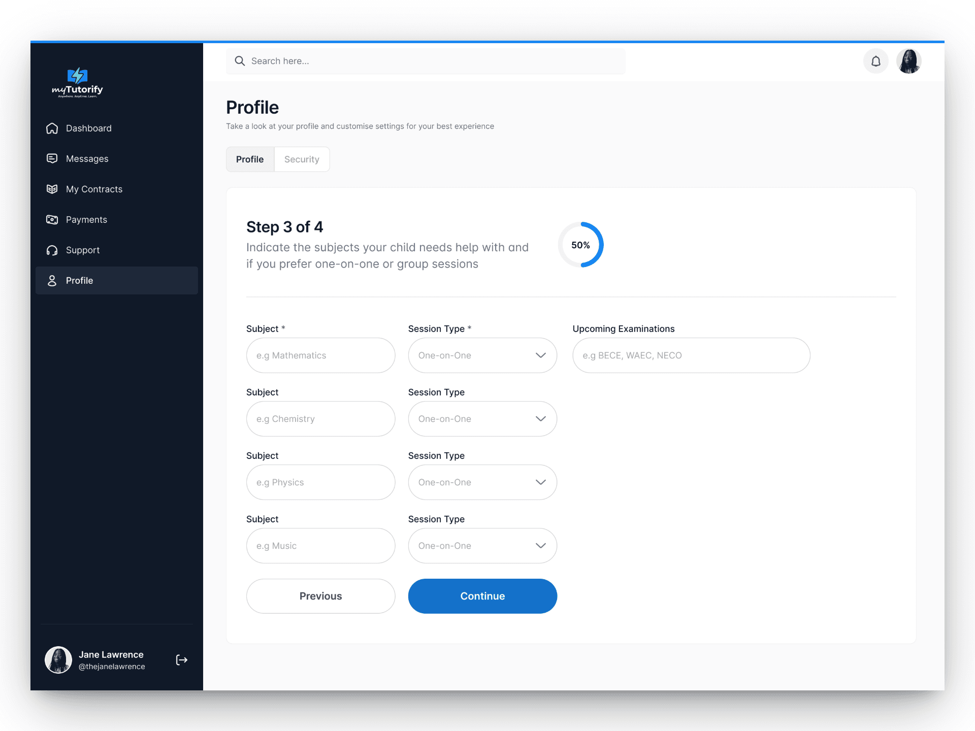 Students start by creating a learner profile, selecting subjects, preferred learning times, and learning goals, so Tutorify can tailor the experience from day one.