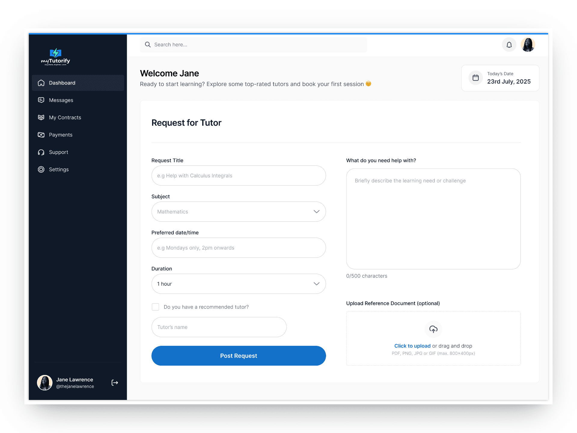Once onboarded, students describe what help is needed, set session preferences, and provide context upfront, allowing tutors to respond with relevant, personalized offers.
